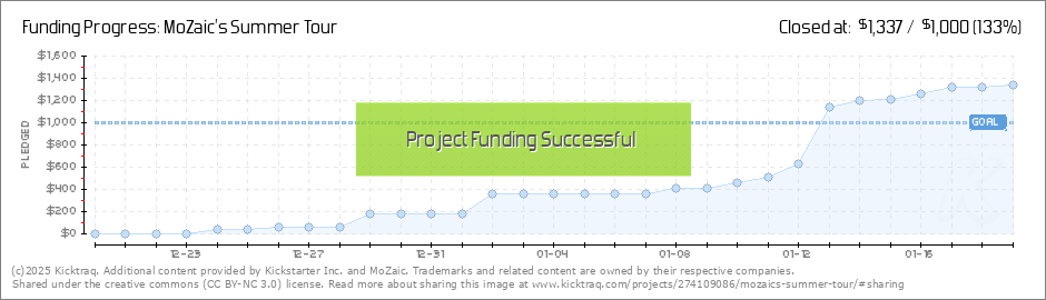 Help your backers reach your daily goals and help others see how you're doing. It's easy, with Kicktraq Mini.Here are a few quick snippits of code you can use to embed your personalized widget on your website, in your blog, and even on your favorite forum.
