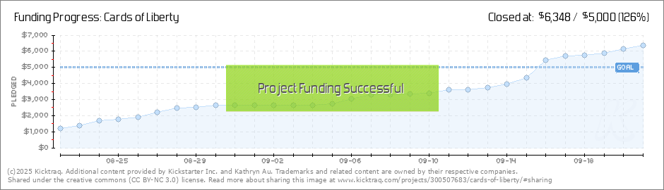 We salute you, our first backers, for getting Cards of Liberty off to a strong start! Thank you so much for your pledges. Update from Su, our production manager. She's set the calendar so - once funded - we can get your Cards of Liberty to you in... (Read More)