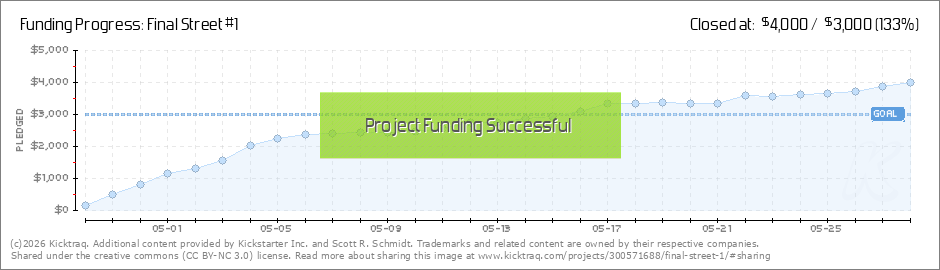 Hey you guys! We would like to thank everyone who's been generous enough to back our project so far! Thank you so much for getting us started off on the right foot! We're just now getting settled back into routine after launching the Final Street... (Read More)