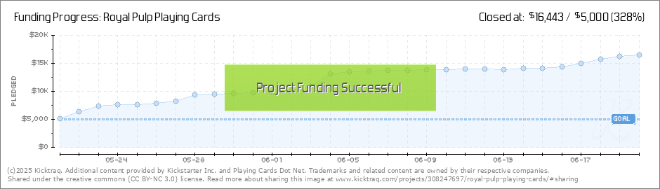 Hello backers! We have now reached $10k and will be printing the standard Royal Pulp decks through USPCC. We have a surprise announcement for you as well-- We will be releasing a limited print run of embossed card sets tomorrow (June 4th) at 12PM... (Read More)