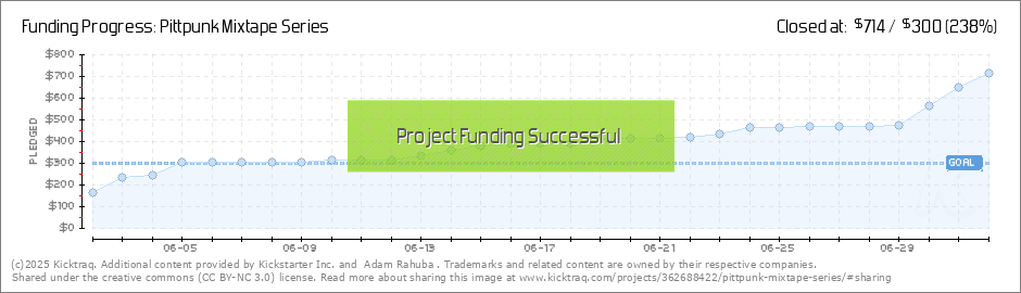 New Stretch Goal! $600It took us only 4 days to reach our goal of producing our compilation, and I can't thank you enough. It means so much to me that my vision of an inclusive Pittsburgh mixtape series seems to resonate with you. We were also... (Read More)