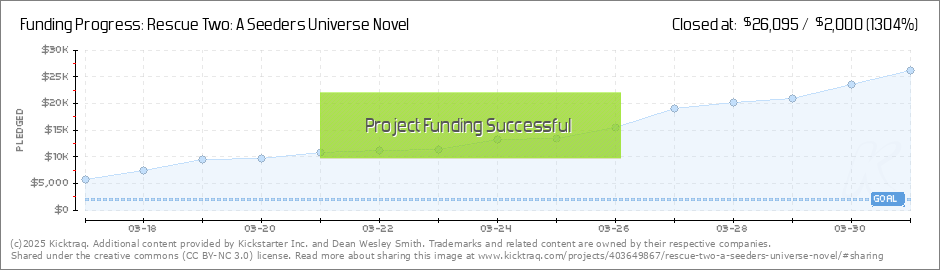 Thank You, Everyone!! And going past this 5th stretch goal adds in some fun stuff. First off, that means all backers not only get the RESCUE TWO Seeders new novel, but also five other books in electronic form. And for the writers, or the writers in... (Read More)