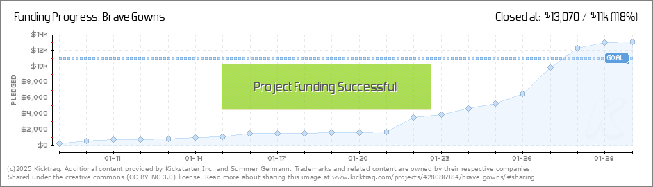 Hi Everyone! I can't thank you enough! Today was amazing! Starting with you all that backed the project to the people that did their best to spread the word, I am left speechless! We can't wait to put Brave Gowns into action. The minute this... (Read More)