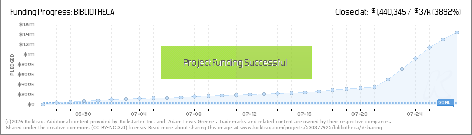 Everyone, Today has been the biggest day for Bibliotheca yet, by more than four times the next largest day. Today alone, at the time of writing this over 1,260 people have backed the project, and we are now 1,278% funded. And, those numbers will be... (Read More)