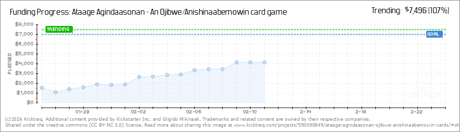 Miigwech for all of your support on day one!Ataage Agindaasonan is finally live. I'm grateful to anyone who has backed and shared so far. Over the upcoming weeks, I'll be sharing progress and behind the scenes updates. Early bird rewards are... (Read More)