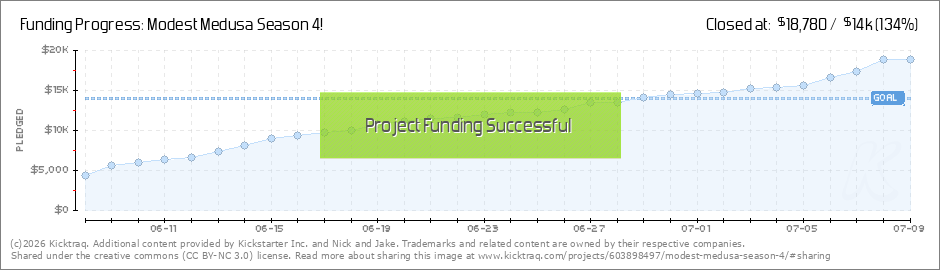 Hi everyone. I wanted to let you know about some small changes to the Rewards and add-on. I've decided to open up a few more "Guest Star in Modest Medusa" slots. I've also added 2 new Reward Levels and a new Add-On. Guest Star in Modest Medusa!... (Read More)