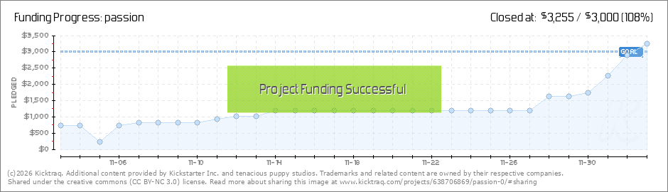 Hello.First off, thank you for backing passion. You didn't have to - you chose to. And that's just awesome.Where we are is simple: there's 900 and change left to go and 40 hrs to do it in.So I'd like to ask a couple of things:1. Share on FB or other... (Read More)