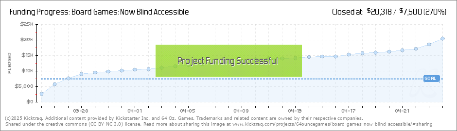 Today we hit 11,000 and we're approaching our second stretch goal. This goal will allow us to release print and play color blind sleeves for lots of different games. I've already have a list of titles that I am working on and hopefully this gesture... (Read More)