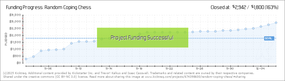 Random Coping Chess has reached it's goal! And we still have three weeks to go!!! This means we have a big opportunity to for stretch goals! Stay posted for updates! Meanwhile, spread the word to your friends that they are now GUARANTEED to get... (Read More)
