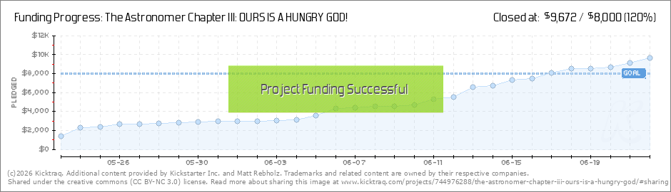 Hey folks! I've added new rewards- original, custom ink drawings in several different sizes: $100 - 9" x 12" $200 - 12" x 18" $400 - 18" x 24" (OR a two page comic) You can now select them individually or just add the amount to another pledge... (Read More)