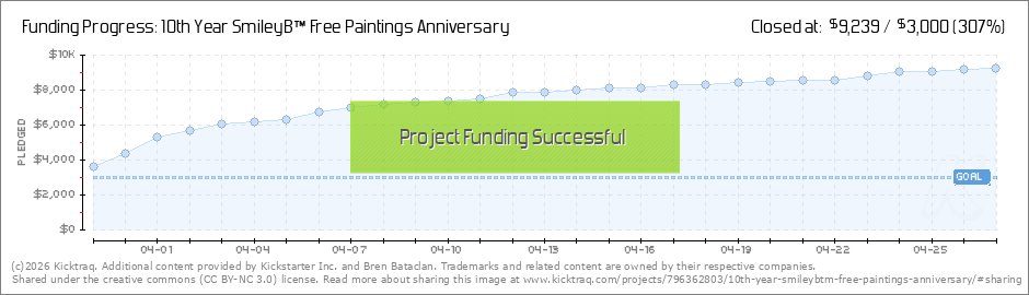 Dear Backers, Here are details on my upcoming 20 state free painting give away schedule: http://smileyb10thyear.blogspot.com/2013/04/10th-year-smileyb-free-paintings.html Thank you very much again for pledging. Bren (Read More)