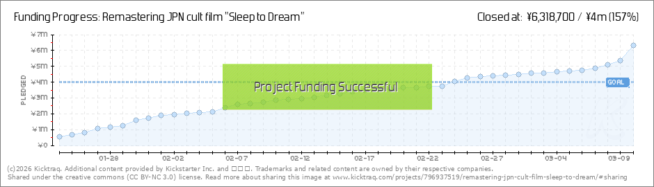Wow, everyone, this is AMAZING! We are overwhelmed by the fact that more than 400 movie goers supported us and we just surpassed our goal of JPY4,000,000! Thanks to ALL OF YOU, we can restore the archival print of To Sleep so as to Dream, because... (Read More)