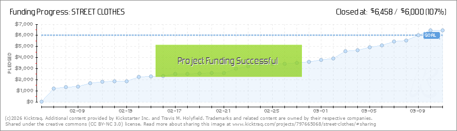 Oh. Wow. You guys... WE DID IT!!!Thanks to your tireless efforts and selfless generosity, STREET CLOTHES hit it's goal this afternoon! We are 100% funded with EXACTLY $6000! BUT WE STILL NEED YOUR HELP!!!I know, and I'm sorry for asking you guys... (Read More)