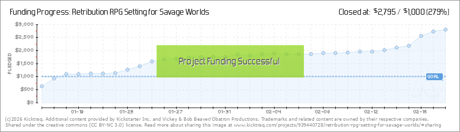 FundedWow! About 2 a.m. Eastern we got our last pledge to put us up over our funding goal. You are super! Thank you for backing Retribution, upgrading, and spreading the word. Stretch Goal Standings We are $127 from our first Fundraising Stretch... (Read More)