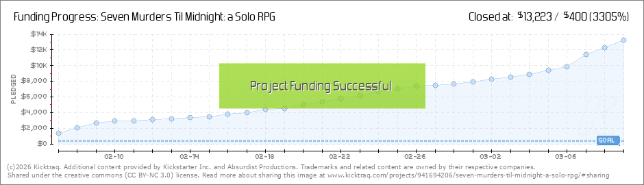 Ladies and Gentlemen, we funded in less than an hour yesterday! So that means Seven Murders til Midnight is now a sure thing. And we've already blown past the first two stretch goals, which means more story content and another fantastic piece of art... (Read More)