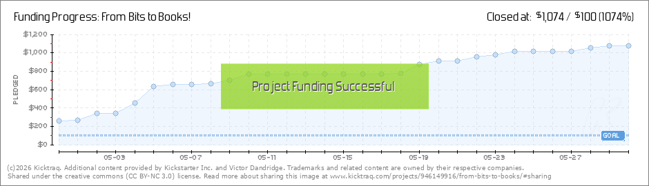 Okay...we're in the last stretches, with just DAYS to go before From Bits to Books comes to a close. But I want to go out just strong as when we started, so I'm setting up a BRAND NEW stretch goal!$1200 -- At this level we'll have enough to fund... (Read More)