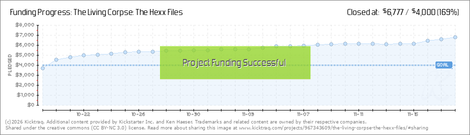 We did it!In less than 24 hours, The Living Corpse: The Hexx Files has met its goal! Thank you to everyone who jumped right on the project right out of the gate! But we are not done yet! Not by a long shot! We've got some great stretch goals coming... (Read More)