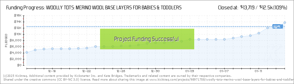 Thank you to the 87 backers who made this journey a reality! We are so excited to get your tots into their woolly base layers! All backers - who signed up for a reward - will be receiving a survey next week that will request your size and color... (Read More)