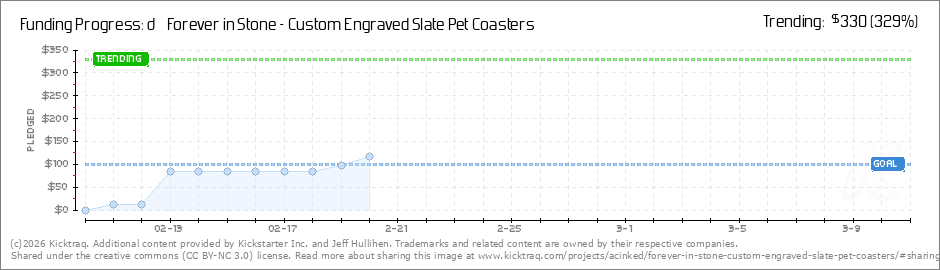 Help your backers reach your daily goals and help others see how you're doing. It's easy, with Kicktraq Mini.Here are a few quick snippits of code you can use to embed your personalized widget on your website, in your blog, and even on your favorite forum.
