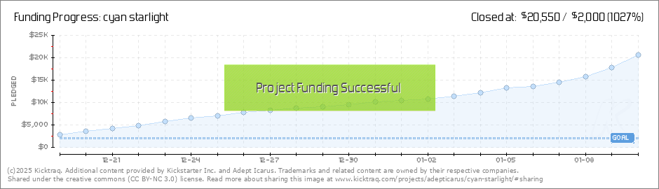 19:32:01 81427765 a great first day! thank you to all of our cyan starlight backers who enabled us to fund on day one! alan and the team are over the moon (some moon) at how quickly it all happened, and we're gameplanning what we'll do next while... (Read More)