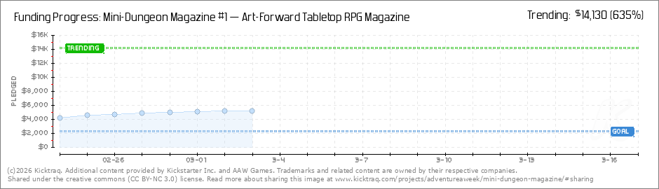 Help your backers reach your daily goals and help others see how you're doing. It's easy, with Kicktraq Mini.Here are a few quick snippits of code you can use to embed your personalized widget on your website, in your blog, and even on your favorite forum.