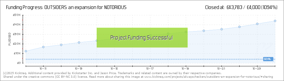 Hey! After a whirlwind launch for this Outsiders campaign, I'm very pleased to say it fully funded within just 30 minutes and quickly went over the 10k mark. This means a few things: confirmation that both Outsiders and Notorious will receive a... (Read More)