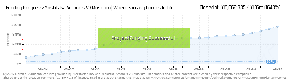 Hello Yoshitaka Amano's VR Museum Supporters, We are happy to announce that the project was 100% funded within 3 hours!! You guys are the best! Thank you all so much for the love and support! We hope to deliver the best experience to you! And! At... (Read More)