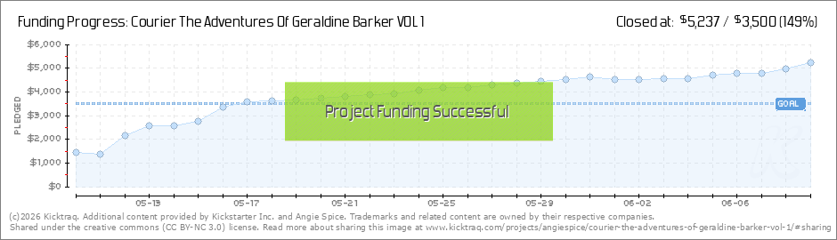 Thank you!!! We did it! We have successfully funded Courier The Adventures Of Geraldine Barker Vol. 1 !!! Wow. I’m amazed it has happened so soon! It hasn’t quite hit me yet! But wow! Thank you!!! This is truly wonderful and I have you to thank!... (Read More)