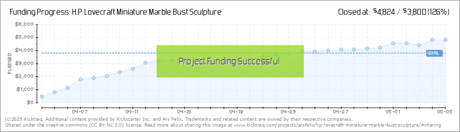 Hello, and thank you for supporting the H.P. Lovecraft bust project! It looks like the project will most likely be funded, so what is the next step? As soon as the project money is dispersed I will be getting a master print of the bust made by... (Read More)