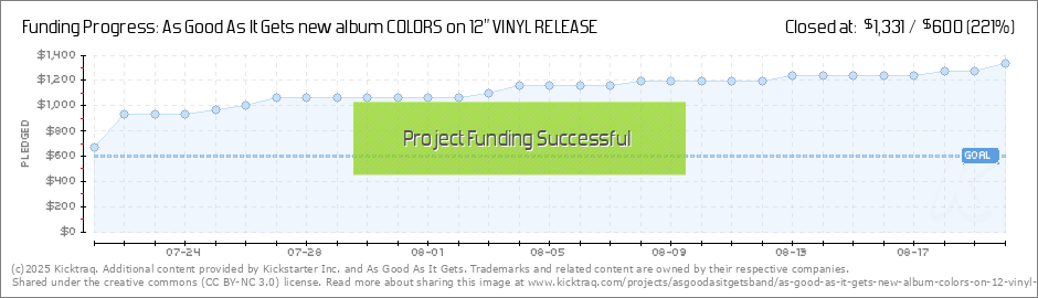 HOLY SMOKES!! ONE WEEK UPDATE: We are absolutely blown away. Thanks to YOU, our amazing backers, As Good As It Gets reached its funding goal in just 2 days! Your support has not only made our dream of pressing COLORS on 12" vinyl a reality, but... (Read More)