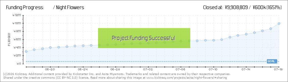 おはようございます。宮本アシタです。 ナイトフラワーズへのご支援ありがとうございます。今朝時点で達成率は676%となり、700%も目前に迫ってきました。... (Read More)