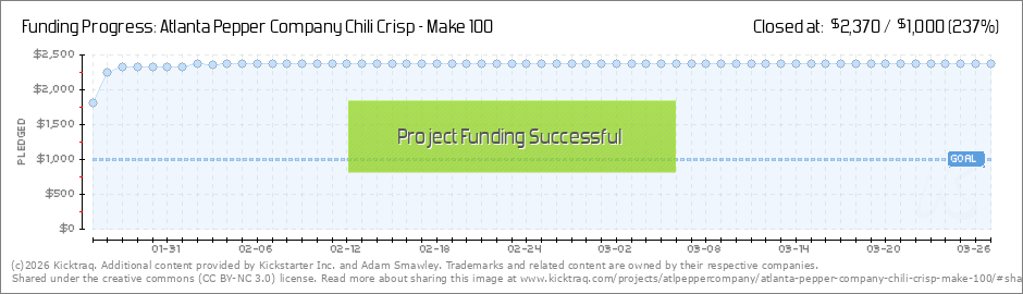 Thank you so much to everyone who has backed my project. Hopefully we will continue forward until we hit our 100 quota! I'm so excited to prepare the first official batch of the OG Chili Crisp! You'll need an HTML5 capable browser to see this... (Read More)