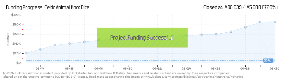 We blew past that $35,000 stretch goal! We now have a choice of animals for each set of 9 six-sided Knot Dice: Wolfhound & Eagle or Boar & Hare. We also have a choice between green and purple for all of the dice. Next Stretch Goal: Horse... (Read More)