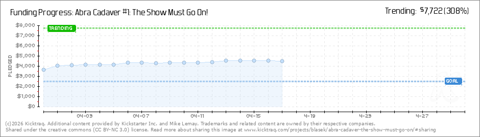 Help your backers reach your daily goals and help others see how you're doing. It's easy, with Kicktraq Mini.Here are a few quick snippits of code you can use to embed your personalized widget on your website, in your blog, and even on your favorite forum.