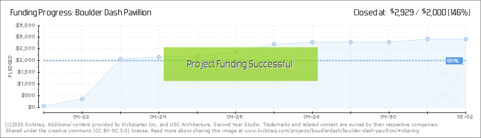 Thank you to all of our backers so far! The pavilion is coming along well - we will have photo updates within the next few days. Though we have met our initial goal on kickstart, Boulder Dash is still estimated to cost between $3500-$4000. We still... (Read More)