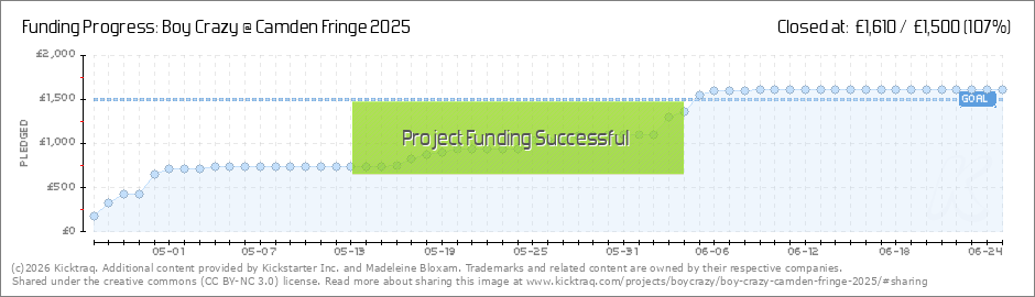 We reached our goal!! Boy Crazy is officially 100% funded.To every single person who backed, shared, screamed into the void on my behalf - THANK YOU. Your support means the world and has made this show possible. We’re now officially go for Camden... (Read More)