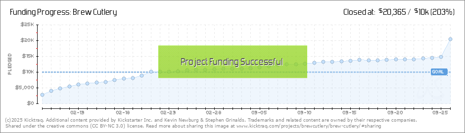 Hey everybody! We did it! You guys rock, our funding goal of $10,000 has been reached in under 13-days! We are so thankful for you guys' support as our Brew Cutlery dream is that much closer to becoming a reality. Even though the campaign funding... (Read More)