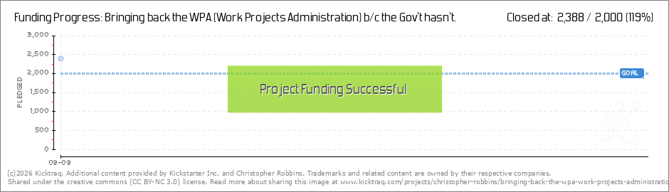 Here's the latest news on Work Projects Administration 2010. WPA-2010 is now fiscally sponsored as a non-profit, so all future donations will be tax deductible to the extent permitted by law. New visitors can make a Donation to the WPA-2010 now... (Read More)