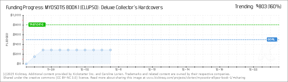 Help your backers reach your daily goals and help others see how you're doing. It's easy, with Kicktraq Mini.Here are a few quick snippits of code you can use to embed your personalized widget on your website, in your blog, and even on your favorite forum.