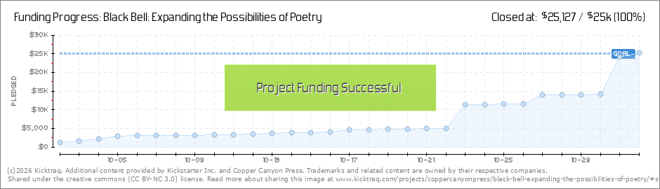 Dear Black Bell Backers, Thank you to the 34 of you who have pledged to our Black Bell: Expanding the Possibilities of Poetry campaign! Your generosity has enabled us to more than double our pledge numbers since our last update. We are so grateful to... (Read More)