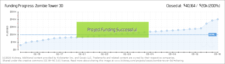 Hi everyone! Thank you all so much for backing Zombie Tower 3D! We have receive almost $6000 pledges during our first day and we are over $10,000 now. We can see Zombie Tower 3D almost coming to life and thank you so much for being part of this!... (Read More)