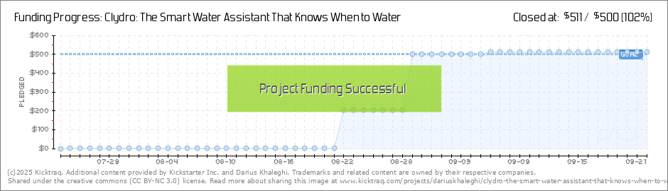 Hello everyone, We are grateful to share that, thanks to your incredible support, Clydro is now fully funded! What started as an idea to help people care for their plants and conserve water has grown into a reality because of you, our backers and... (Read More)