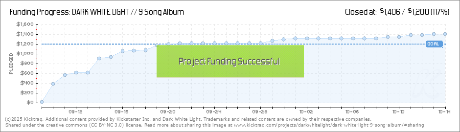 Early Sunday morning Dark White Light reached the "point of no return". In Kickstarter terms that means, WE REACHED OUR GOAL! At this stage, we (the band and our backers) are committed to fulfill all pledges and rewards. Our fundamental obligation... (Read More)