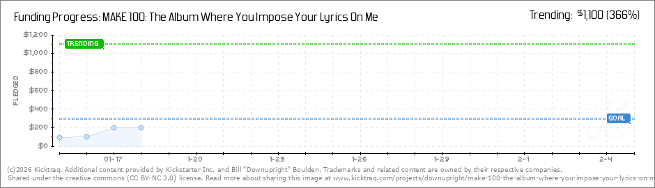 Help your backers reach your daily goals and help others see how you're doing. It's easy, with Kicktraq Mini.Here are a few quick snippits of code you can use to embed your personalized widget on your website, in your blog, and even on your favorite forum.