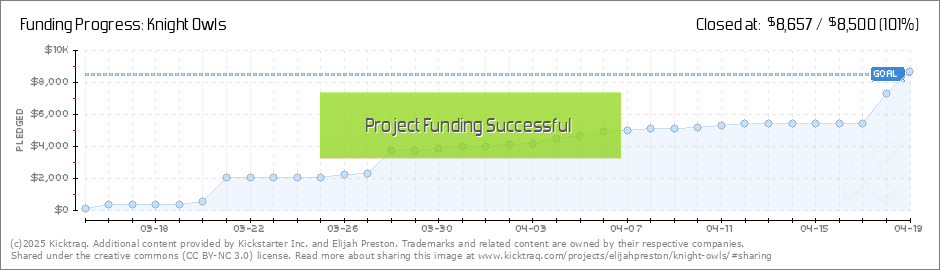 Hello Backers! Thank you all so much for the continued support on Knight Owls! We are less than $50 away from being 60% funded! We are in the home stretch now. Please continue to share the Kickstarter with friends and family, and be sure to follow... (Read More)