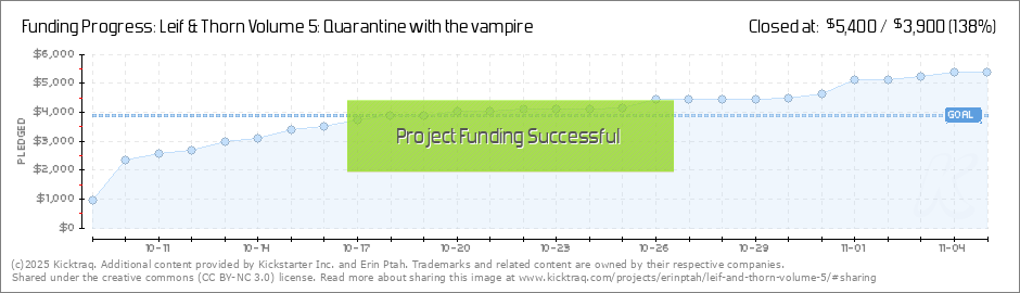 One day into the Leif & Thorn Volume 5 campaign, let's see how it's doing... The progress bar is up! This year's version has a pretty blue palette and a Mysterious White-Haired Girl: Hitting the ground running at 58%, aww yeah. The goal this year... (Read More)