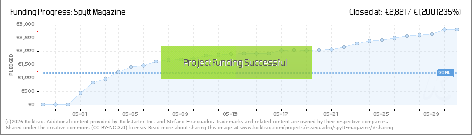 Ciao! Il progetto è oggi finanziato al 150%! Grazie! Per ringraziarvi di averci creduto così tanto, aumenterò le dimensioni di Spytt, portandolo a 92 pagine. Userò questo spazio per dare più risalto ad alcuni dei 20 artisti che saranno ospitati... (Read More)