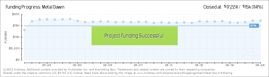 Hey Backers! We've done it! We're fully funded! We thank you for having faith in Metal Dawn! We have a bunch of great new content-filled stretch goals that we'd like to push to unlock! New Agents, Zones, Weapons and Gear and more! Be sure to share... (Read More)