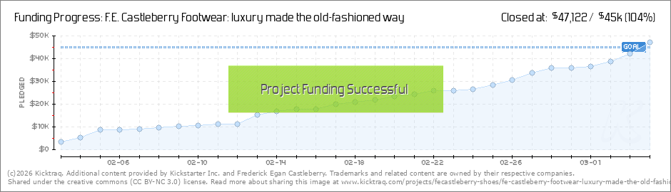 Thank you all so much for pre-ordering your F.E. Castleberry Footwear. We've reached 49% of our funding goal and are on a good pace...but it's this last two weeks where the cream rises to the top. WE WILL RISE! Continue to share on your social... (Read More)