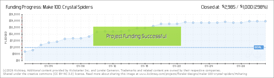 Hi! A quick update here. We've got less than two weeks to go and I've got 50 spiders made! To celebrate this stellar progress, both in your stunning support and in my own ability to keep apace of demand, I'll be releasing a one-of-a-kind spider at... (Read More)
